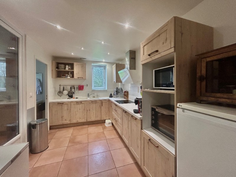 La maison principale, d’environ 224 m² habitables, se compose au rez-de-chaussée de spacieuses pièces de vie équipées d’un poêle à granulés et d’un poêle à bois, d’une cuisine aménagée et équipée, d’un cellier, d’une chambre, d’une salle d’eau et d’un WC.